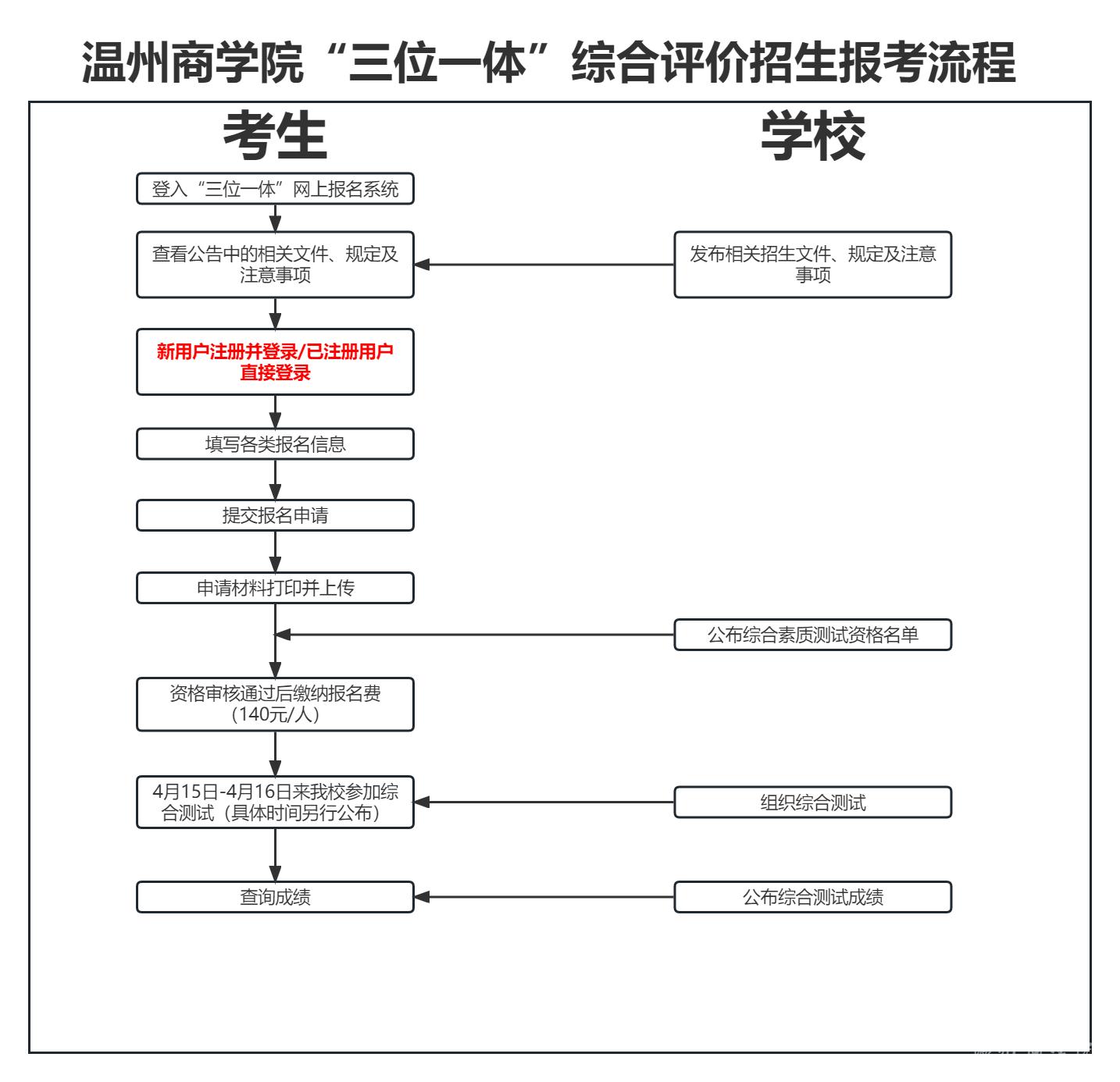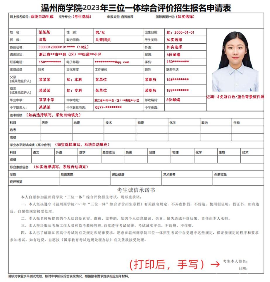 我校2023年“三位一体”综合评价招生采用网上报名,报名系统开放时间为2023年3月1日-3月20日。届时考生可登录我校招生网,点击“三位一体报名系统(3w1t.wzbc.edu.cn)”,根据页面提示的“报考流程”办理报名相关手续。(注:附件1我校2023年“三位一体”综合评价招生报考流程;附件2考生网上报名申请表样表,考生可参考样表了解所需报名信息,切勿复制该表进行填写。)