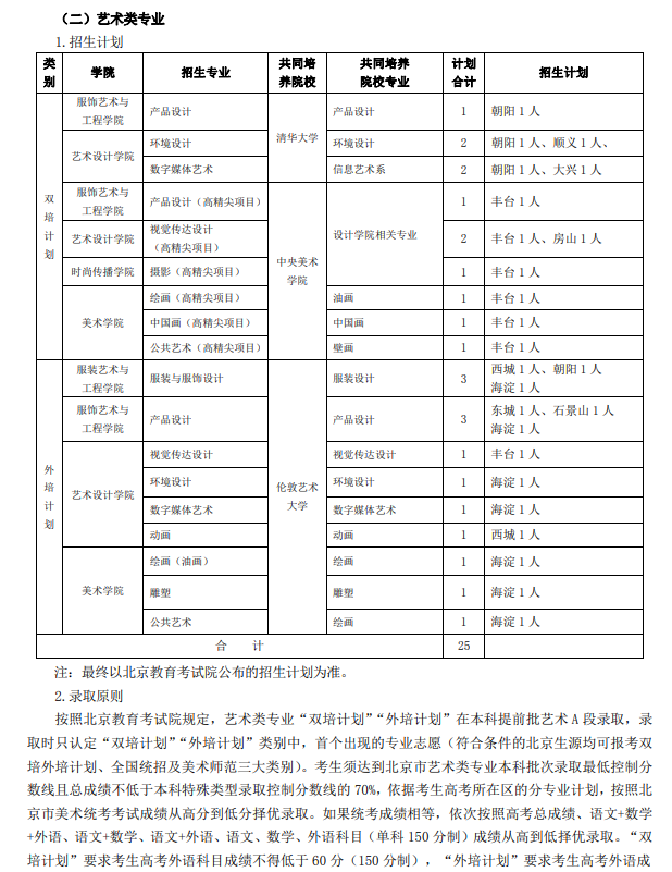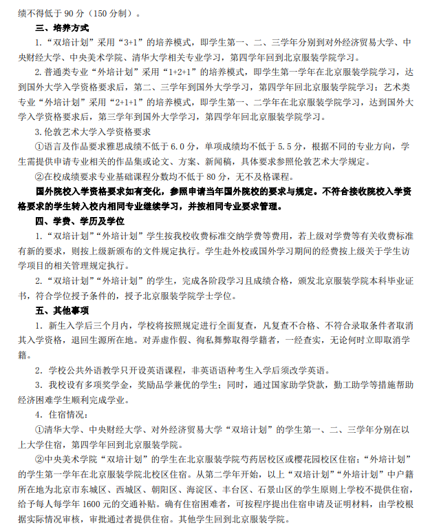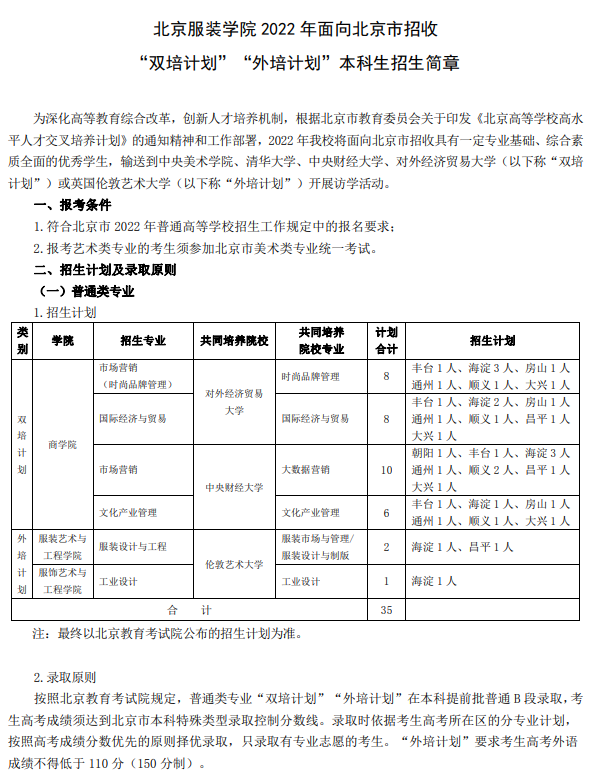 北京服装学院2022年面向北京市招收 “双培计划”“外培计划”本科生招生简章