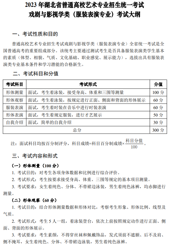2023年湖北省普通高校艺术专业招生统一考试戏剧与影视学类(服装表演专业)考试大纲