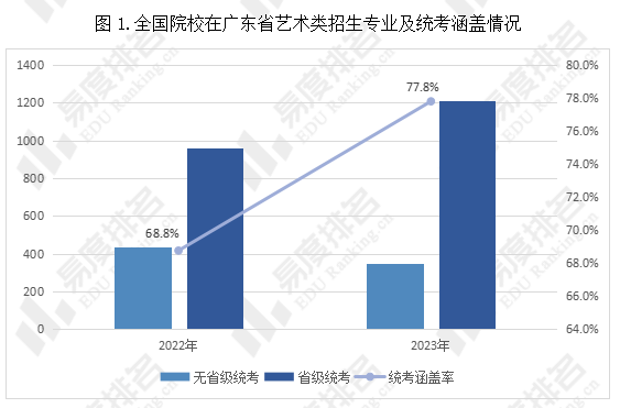 近年来教育部不断提高对艺术类专业考试招生工作的重视,加强和改进全国高校艺术类专业。2023年全国院校在广东省招生的艺术类专业数为1553个,专业数较去年增加11.6%。此次普通高校招生主要面向学历层次为本科的考生,专科可报专业数较去年增加2个。由于省级统考的不断完善和规范,2023年无省级统考的院校招生专业数较去年下降约21%;全国院校在广东省艺术类专业统考涵盖率达77.8%,较去年上升9%。