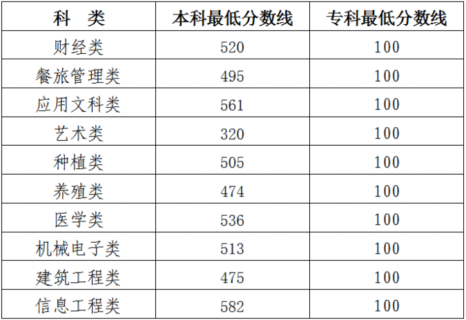 (2)2023年吉林省普通高校对口招生统一考试各科类、批次录取最低控制分数线见下表: