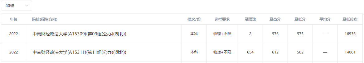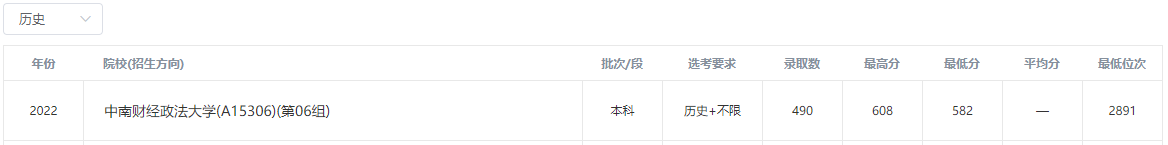 2022年中南财经政法大学在本省历史/物理录取分数线