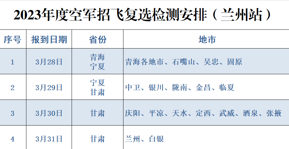 空军招飞局兰州选拔中心拟于3月28日至4月2日在甘肃省兰州市设站,组织甘肃、青海、宁夏高三男生参加招飞复选检测。