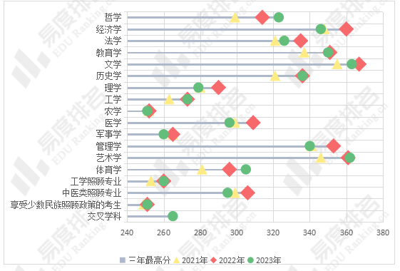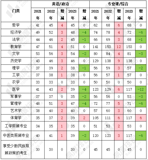 2023年除体育学外,其他学科类型的科目最低分要求均降低或不变。由于近年经济持续下行,金融行业的人才需要也相对饱和,经济学报考热度降低,不仅国家线下降最多,各科目的最低分数要求也降低最多,英语/政治降低了4分,专业课降低了6分。