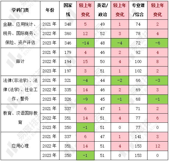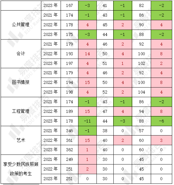 表 2 2021-2023年国家线及各科目最低分要求(专业学位A类)