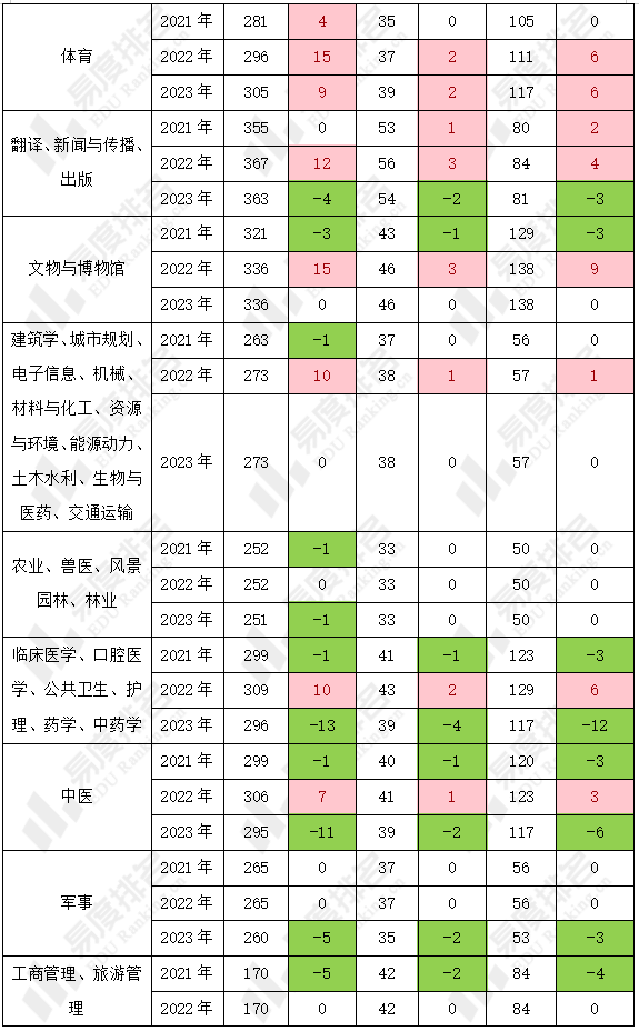 艺术、体育报考热度持续上升,其国家线逆风上涨,2023年艺术学专业学位与学术学位国家线均上涨1分,体育学则均上涨了9分。这两个学科专业热度如此之高的原因在于:1.国家实行双减政策,大力惩治文化课校外培训,艺术与体育教育的就业市场更加开阔。2.国家对艺术、体育教育越发重视,《义务教育课程方案和课程标准(2022年版)》中不仅将艺术课程正式纳入了义务教育的必修课,还明确了艺术课程的设置、标准和教学目标。