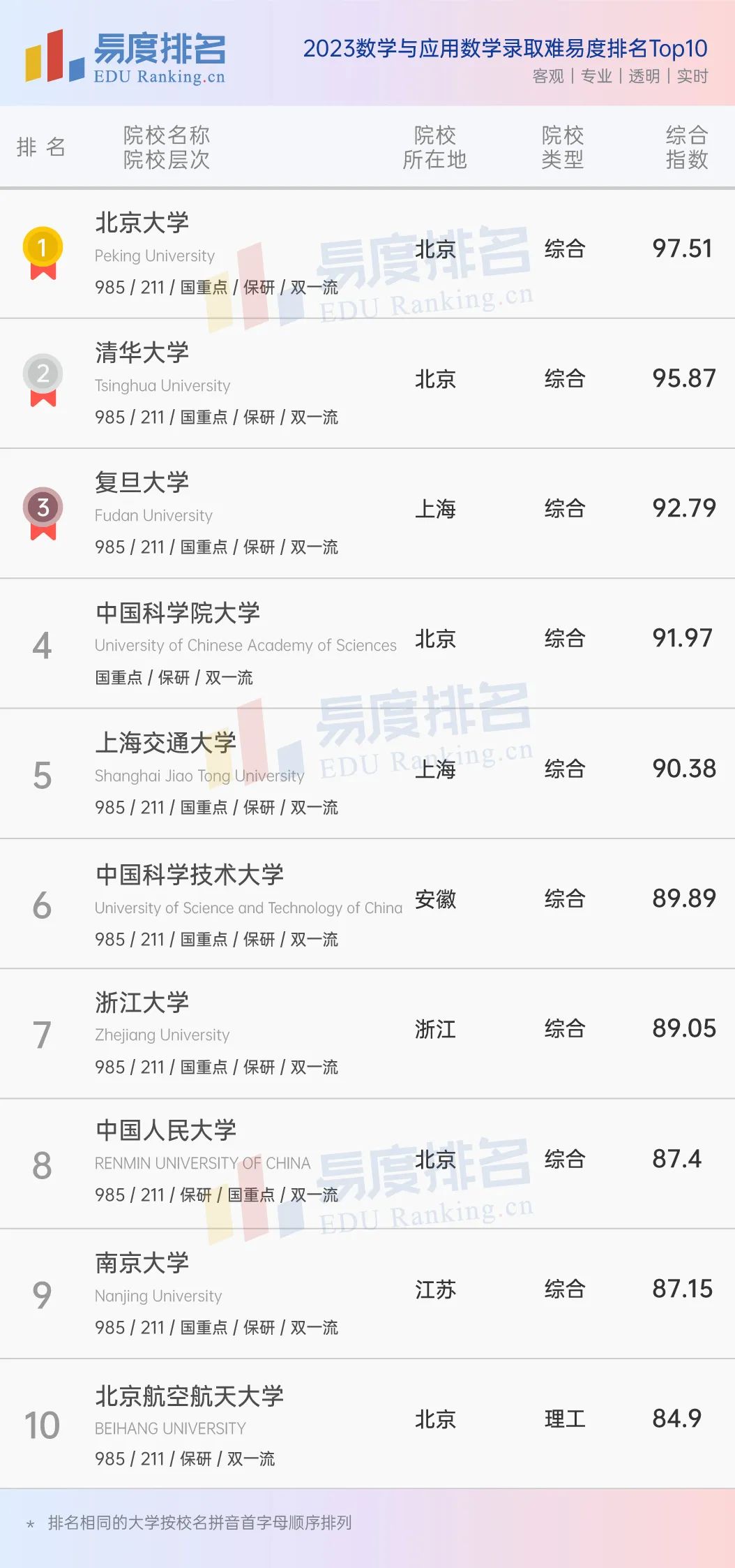 1.数学与应用数学排名Top10