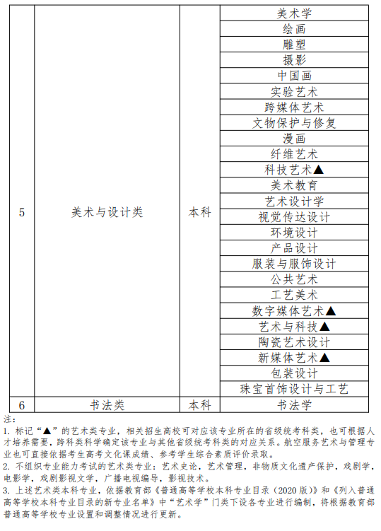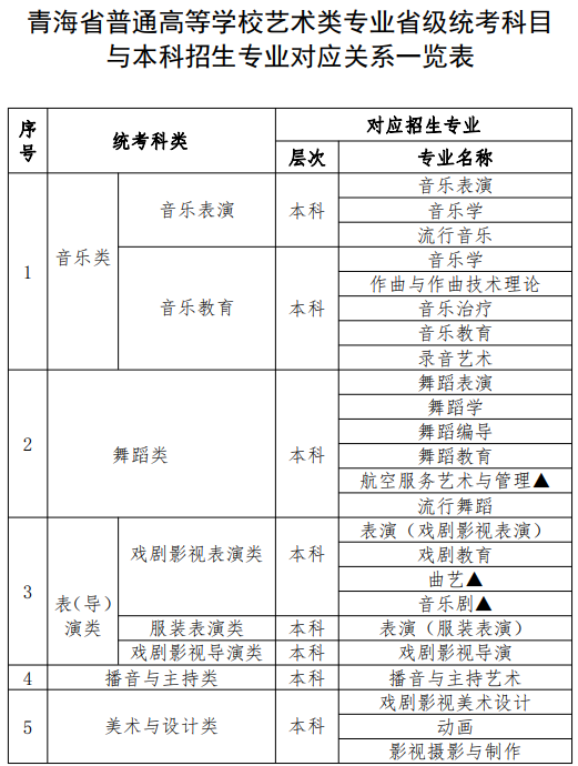 青海省普通高等学校艺术类专业省级统考科目与本科招生专业对应关系一览表