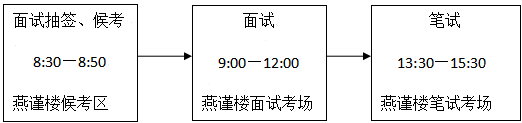 8:30—8:50 | 考生按户籍所在区,进入相应候考区,进行面试抽签,填写面试排序表 | 燕谨楼106(延庆) 燕谨楼108(怀柔) 燕谨楼109(通州、昌平、顺义、大兴) 燕谨楼111(房山、密云、平谷、门头沟) |