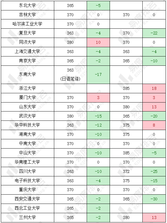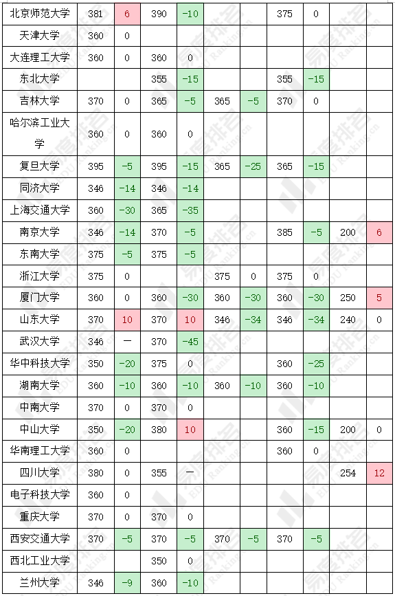 从整体上来看,这两个专业的录取复试线较为接近,但在个别院校二者之间可能会出现较大差异。如:北京师范大学这两个专业的复试线差值为27分,武汉大学、兰州大学、中山大学复试线差值也高达15分。