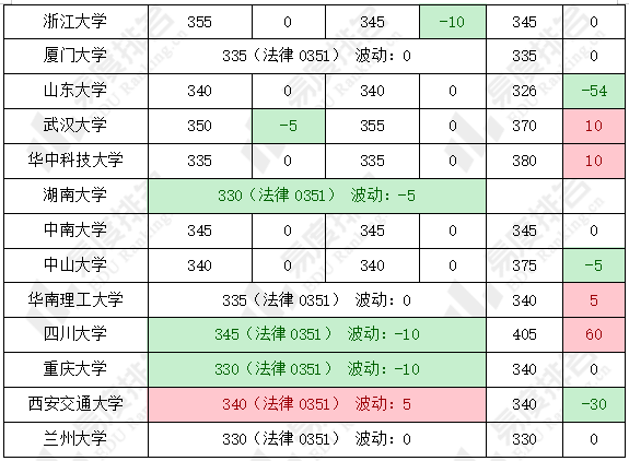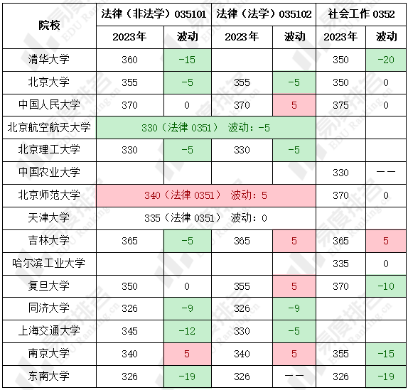 法学类专业复试线整体呈下降趋势。法律(非法学)、法律(法学)复试线波动幅度大多在-10到5分之间,但法律(非法学)的下降幅度更高,同济大学、东南大学复试线最低,仅为国家线326分;社会工作在部分院校的复试线波动较大,如:山东大学该专业复试线下降高达54分,而四川大学该专业上涨60分。