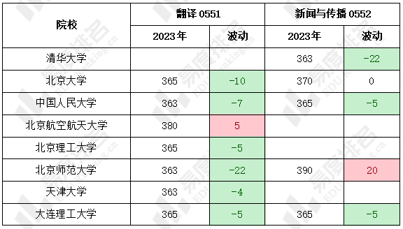 翻译、新闻与传播专业复试线均有所下滑。北京师范大学翻译专业下降幅度最大,为22分;西安交通大学新闻与传播下降幅度最大,为30分。