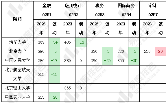 审计复试线逆风上涨,所有学校该专业的复试线均上升或不变,北京大学复试线上涨最多,高达20分,四川大学则以254分位居榜首。
