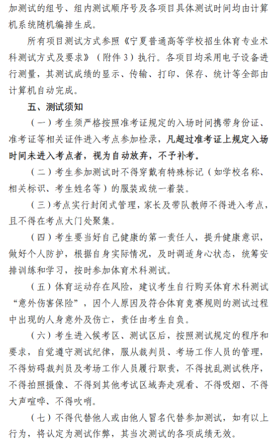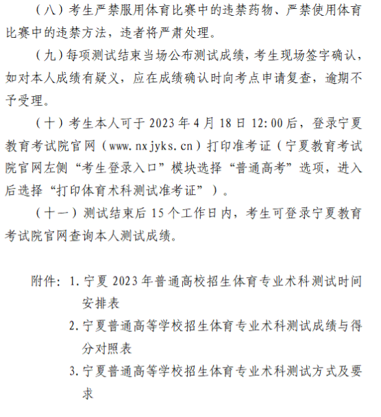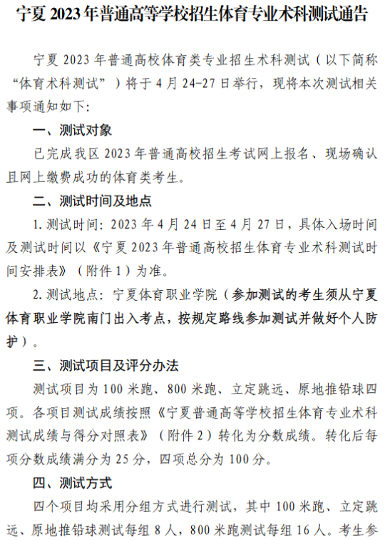 附件:[1] 附件1-宁夏2023年普通高校招生体育专业术科测试时间安排表.doc[2] 附件2-宁夏普通高等学校招生体育专业术科测试成绩与得分对照表.doc[3] 附件3-宁夏普通高等学校招生体育专业术科测试方式及要求.doc