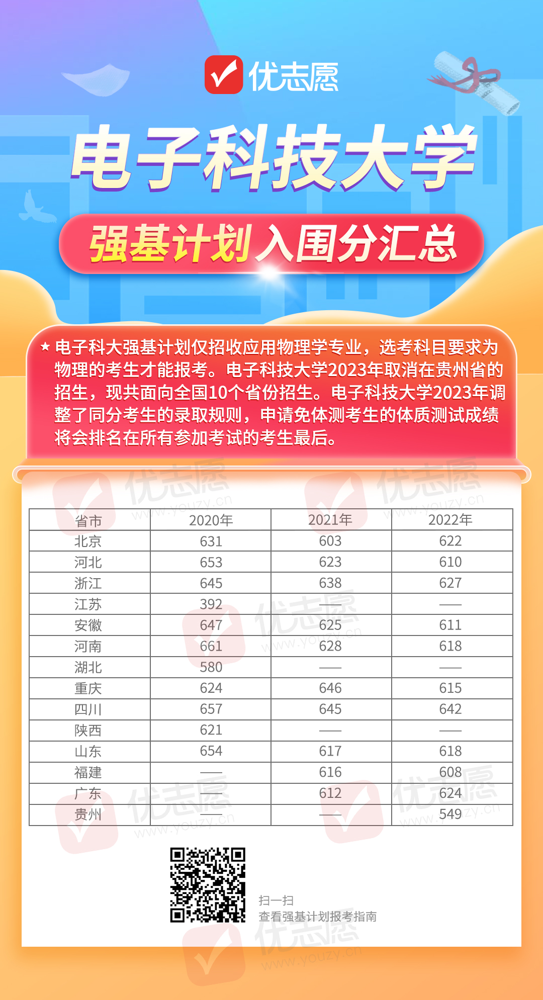 近日各高校强基计划招生简章陆续发布中,为了帮助考生更好地选择院校与专业,小优为大家汇总了电子科技大学近3年的入围分,大家可以根据历年数据与自身情况进行报考。注:如果高校在该省份当年没有招生或者没有公布入围分数线将用“—”表示。