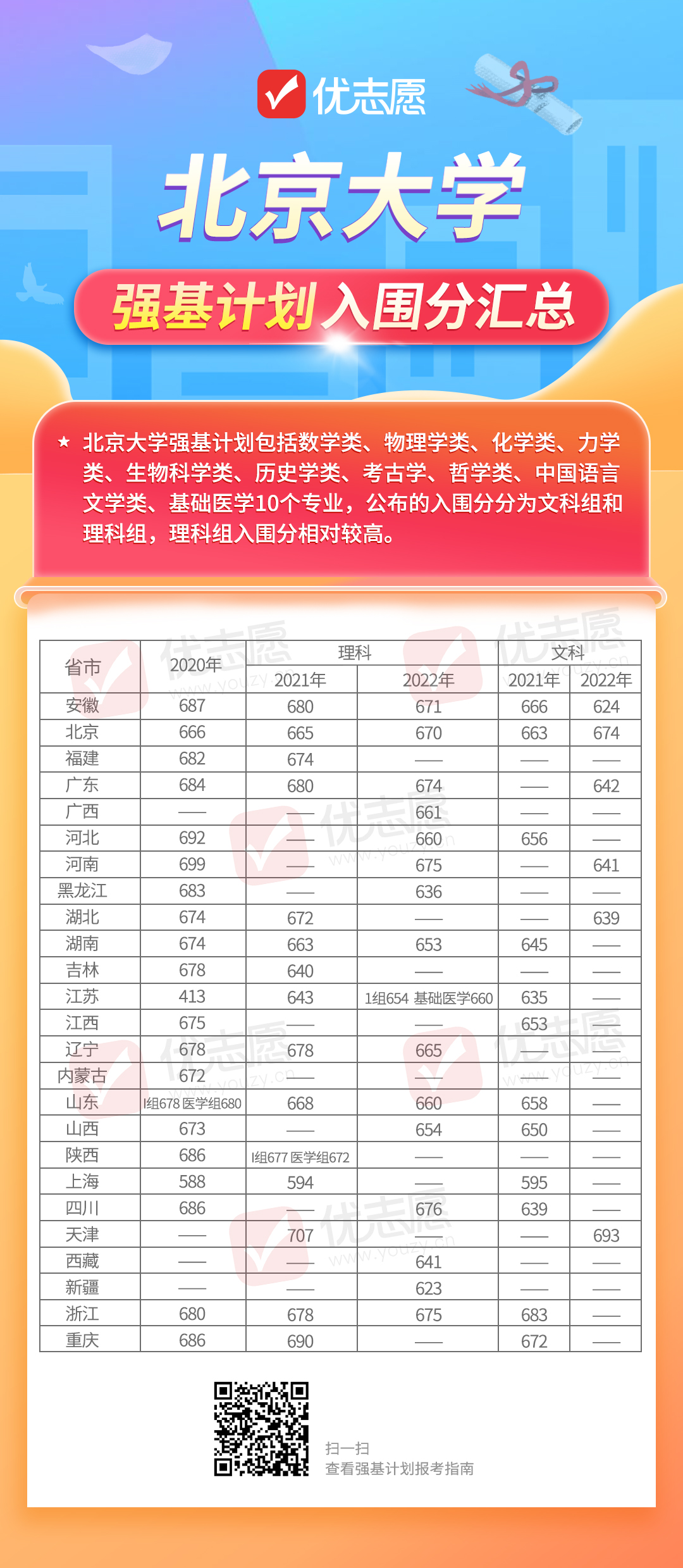 近日各高校强基计划招生简章陆续发布中,为了帮助考生更好地选择院校与专业,小优为大家汇总了北京大学强基近3年的入围分,大家可以根据历年数据与自身情况进行报考。注:如果高校在该省份当年没有招生或者没有公布入围分数线将用“—”表示。