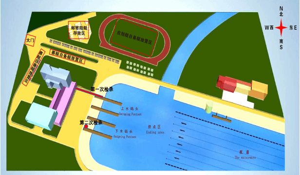 考生点名第一次检录,由带队人员带往虹膜验证点进行虹膜验证、核对信息、随机分组、佩带匿名化标签,第二次检录领取航道牌、救生衣,再下水前往起点进行考试。