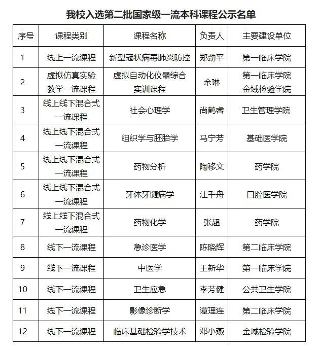 4月11日,教育部公示了第二批国家级一流本科课程,拟认定5751门课程为第二批国家级一流本科课程。我校12门课程被公示为第二批国家级一流本科课程,其中“新型冠状病毒肺炎防控”被认定为线上一流课程;“虚拟