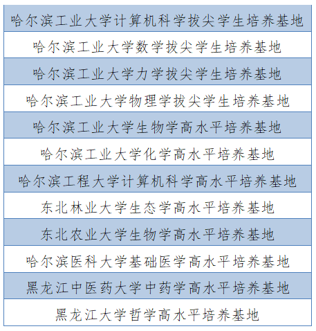 此前,省教育厅印发《关于公布首批基础学科高水平培养基地名单的通知》,在数学、物理学、化学、生物学、计算机科学、力学、生态学、基础医学、中药学、哲学等学科领域,依托哈尔滨工业大学、哈尔滨工程大学、东北林业大学、东北农业大学、哈尔滨医科大学、黑龙江中医药大学、黑龙江大学等7所高校布局12个省级基础学科高水平培养基地。