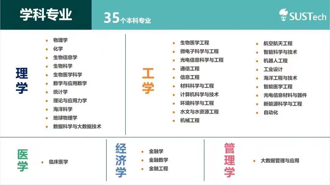 南科大现有8个二级学院35个本科招生专业,如下图所示: