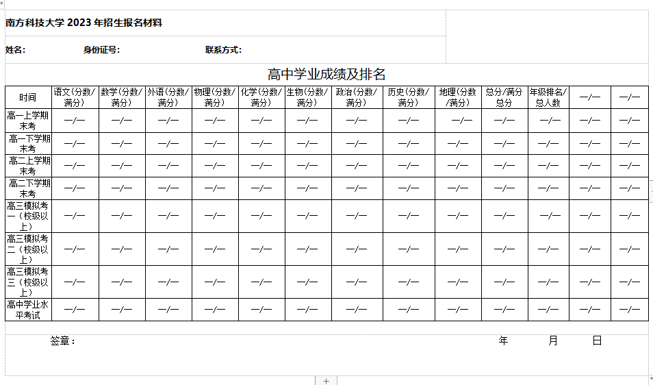 高一高二四个学期的期末成绩、高三至少两次模考成绩必不可少,总分和排名也需提供;如果模考成绩次数不够,可用其他校级或以上考试成绩代替;学业水平考试成绩不影响初审,可以不提供;高中成绩表可使用报名系统下载的模板,也可使用中学出具的成绩单。如果中学提供有自己版本的成绩表,只要包含报名系统所要求的成绩项目也可以。高中成绩表上传支持图片格式和PDF文件格式,大小在5MB以内。