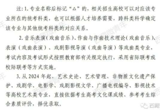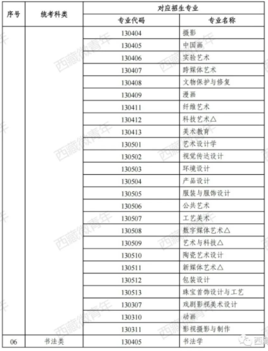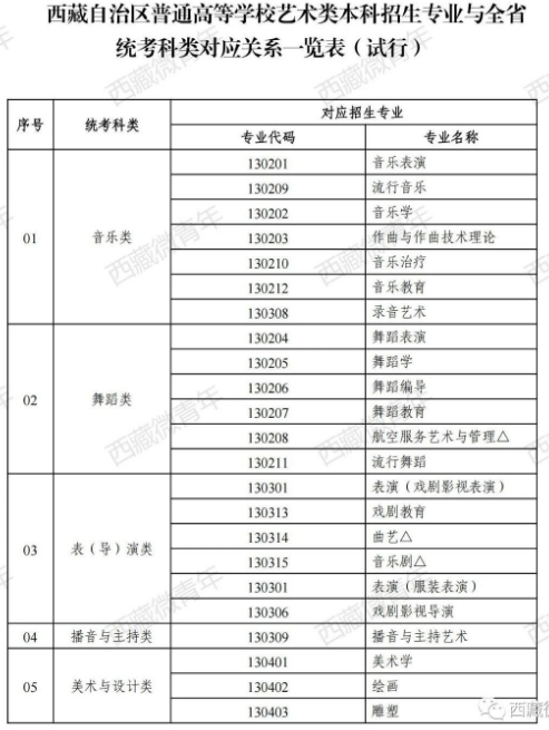 西藏自治区普通高等学校艺术类本科招生专业与全省统考科类对应关系一览表(试行)