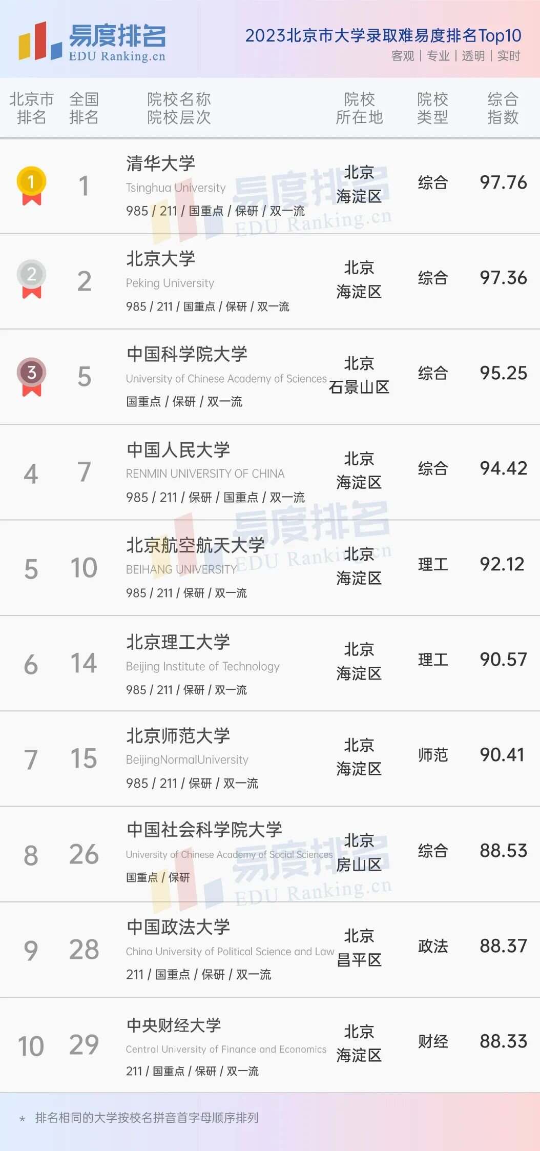 很多情况下,不少学生们在选择大学时,都会优先选择城市再选择大学,一般在经济发达的城市,高校资源都更优异。2023全国高考即将来临,为了给全国各地想要报考北京市大学的考生提供更具参考价值的排名,本期易度排名将公布“2023北京市大学录取难易度排名”完整榜单,一起来了解这些大学的录取难度究竟如何。
