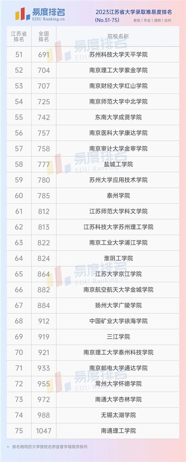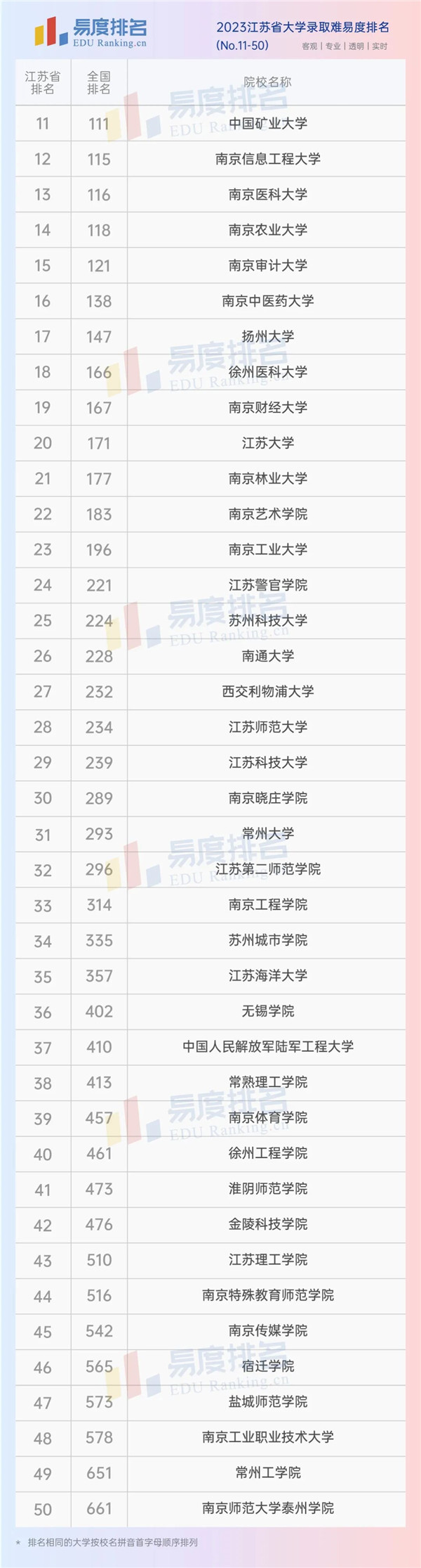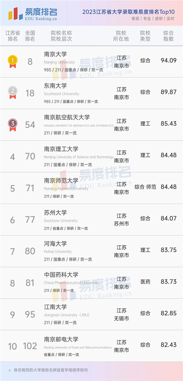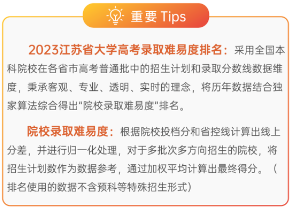 “2023江苏省大学录取难易度排名”的对象是中国75所本科级院校。上榜的70多所院校中,985/211院校共11所,双一流院校共16所。