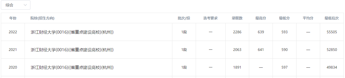 近三年浙江财经大学在浙江录取分数线