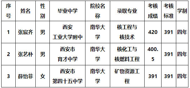 根据教育部《关于同意南华大学部分核类本科专业继续试行单独招生的函》(教学司函〔2012〕103号)要求,现将2023年南华大学核类专业单独招生在陕拟录取考生名单进行公示,接受社会监督。如对公示内容有疑义,请向省招办反映。联系电话:029—85221751。