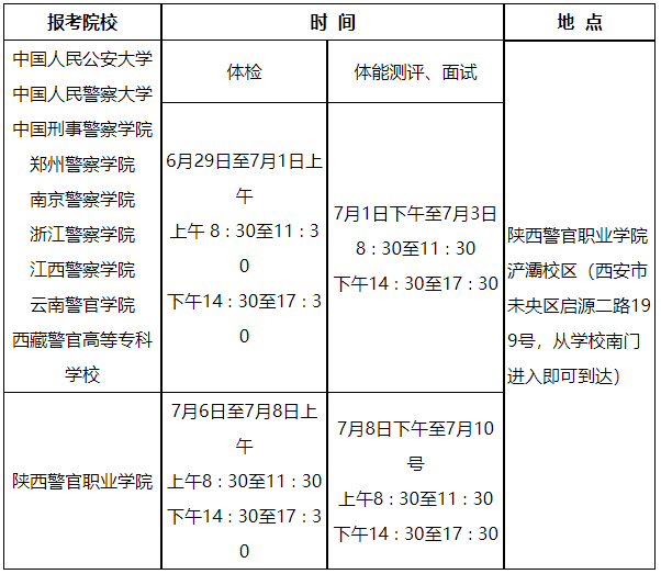 为减少人员聚集,参加体检的考生要提前进行预约。报考公安院校公安专业且在陕西省教育考试院门户网站公示的考生(陕西警官职业学院公安专业除外)须于6月28日9∶00至17∶00,登录陕西省公安厅门户网站扫描二维码后按要求预约体检时间;报考陕西警官职业学院公安专业且在陕西省教育考试院门户网站公示的考生须于7月5日9∶00至17∶00,登录陕西省公安厅门户网站扫描二维码后按要求预约体检时间。预约成功的考生按预约时间,携带第二代居民身份证、户口本、准考证、普通高级中学毕业证、公安机关审查合格政治考察表、《2023年陕西省普通高等学校招生体检表》(由各县(区)招生办负责提供复印件,一式两份)及《公安院校公安专业本专科招生患病经历申报表》(附件3,由本人如实填写)依次进行体检、体能测评和面试。体检实行单项淘汰,体检合格的考生方可进入体能测评和面试环节。体检、体能测评和面试工作现场实行封闭式管理,具体时间及地点安排如下:
