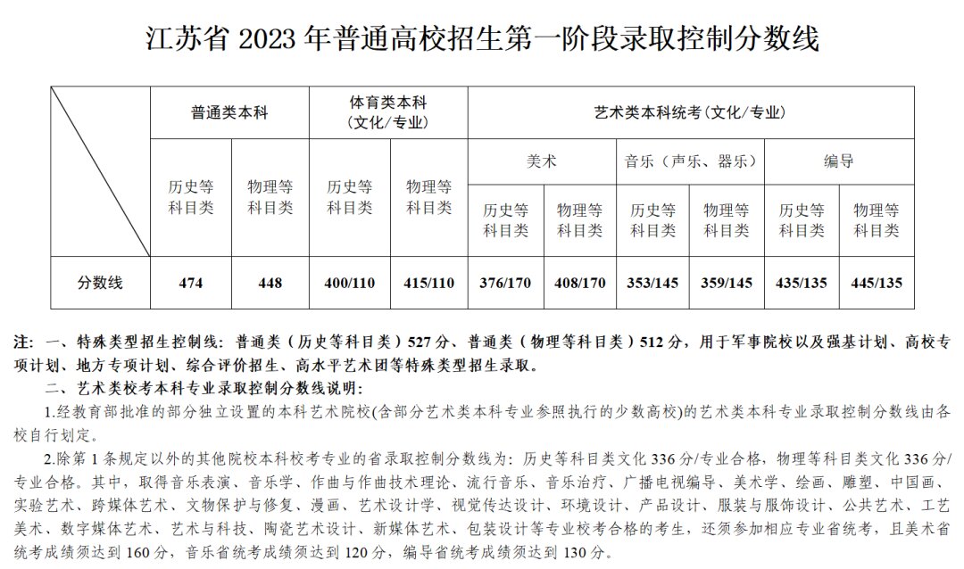 文章来源:江苏省教育考试院 江苏省2023年普通高校招生第一阶段录取控制分数线
