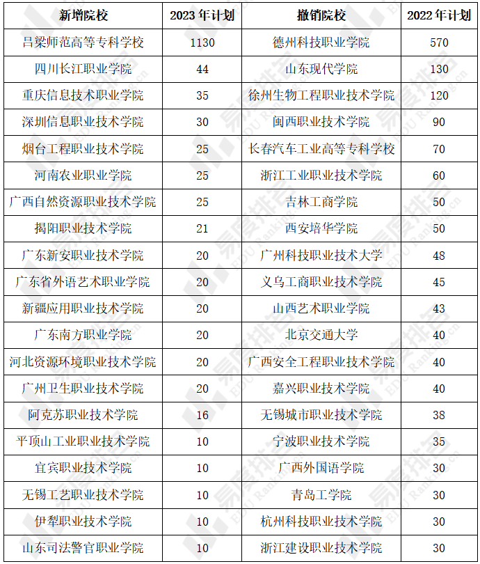 表 1 2023年山西高考新增与撤销院校(专科普通类招生)