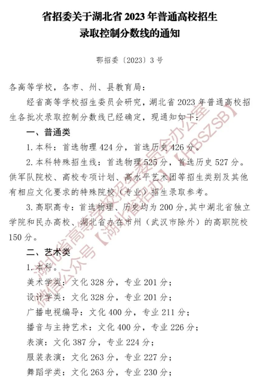 文章来源:湖北省招办微信号 省招委关于湖北省2023年普通高校招生录取控制分数线的通知