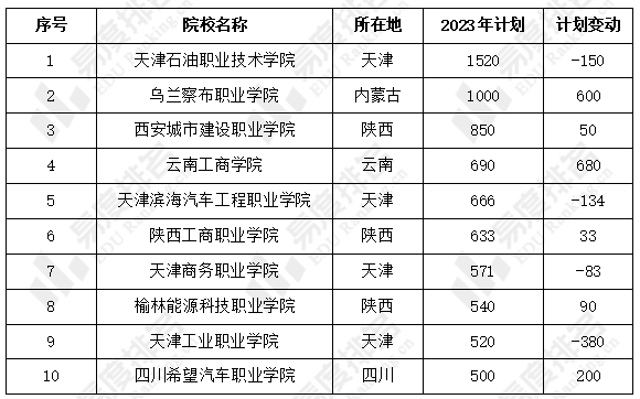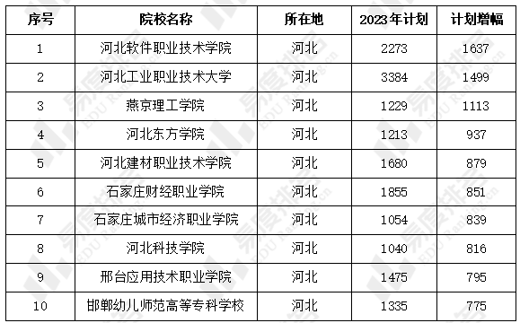 表 2 2023年河北高考扩招TOP10高校(专科普通类招生)