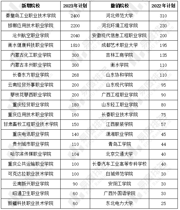 表 1 2023年河北高考新增与撤销院校TOP20(专科普通类招生)