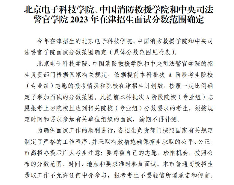 北京电子科技学院、中国消防救援学院和中央司法警官学院2023年在津招生面试分数范围确定