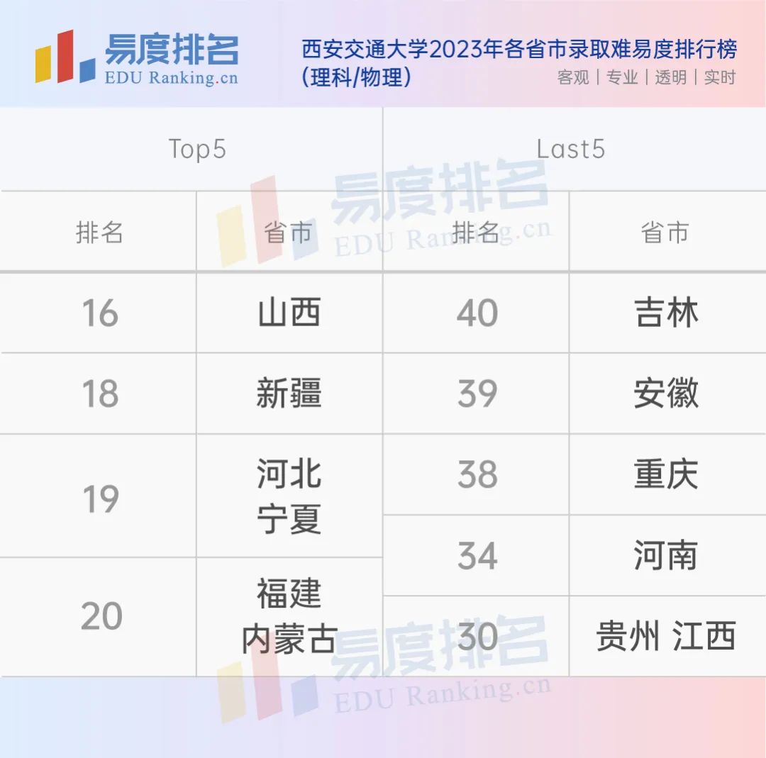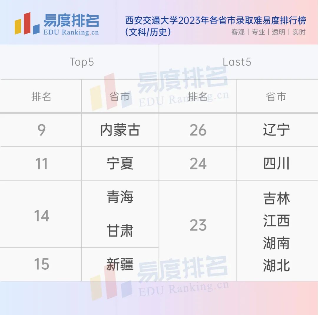 西安交通大学在“2023年各省市录取难易度排行榜”中的物理和理科方向排名前五和最后五名的省市,内蒙古、宁夏、青海等偏远地区在文理方向的报考难度都是极大的,吉林、江西等地的报考性价比相对更高。西安交通大学在陕西省理科和文科的录取难易度分别为28名和21名。