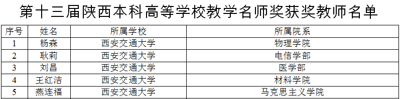 今年1月,陕西省教育厅发布了《关于表彰第十三届陕西普通本科高等学校教学名师奖获奖教师的通知》,西安交通大学5名教师获奖,获奖人数全省第一。