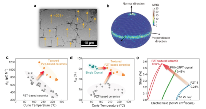 今年4月7日,《科学》期刊在线发表了西安交通大学在高性能织构压电陶瓷方面的最新研究成果——《晶粒定向排列的锆钛酸铅陶瓷》。该研究团队解决了几十年来PZT陶瓷无法被高质量织构化的学术难题,首次制备出了PZT织构陶瓷,在该领域有了重大突破。