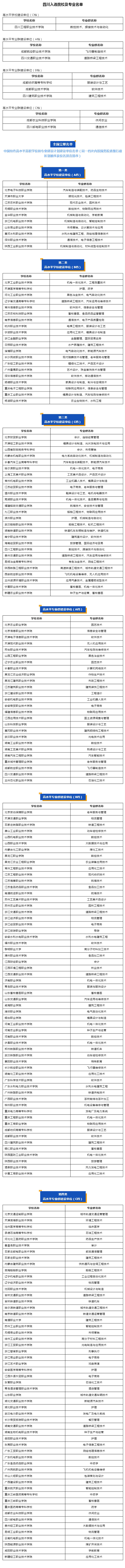 目前,我省专科批次志愿填报正在进行。高职(专科)院校数量众多,为了给考生和家长选择院校提供参考,川小招整理了我省及全国进入教育部“双高计划”的院校和专业名单。