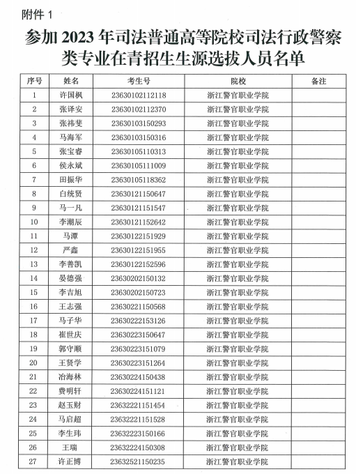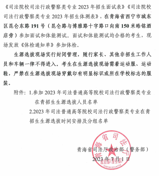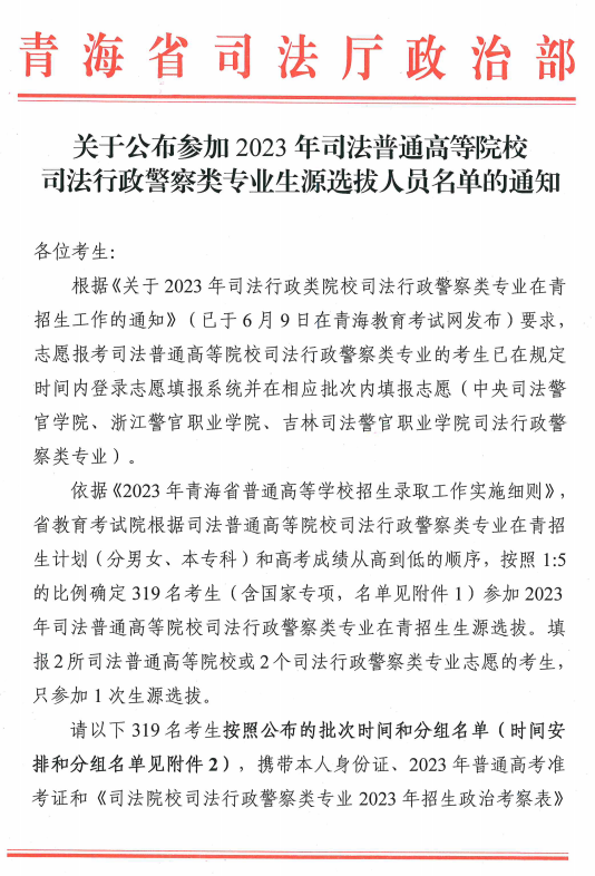 关于公布参加2023年司法普通高等院校司法行政警察类专业生源选拔人员名单的通知点击查看