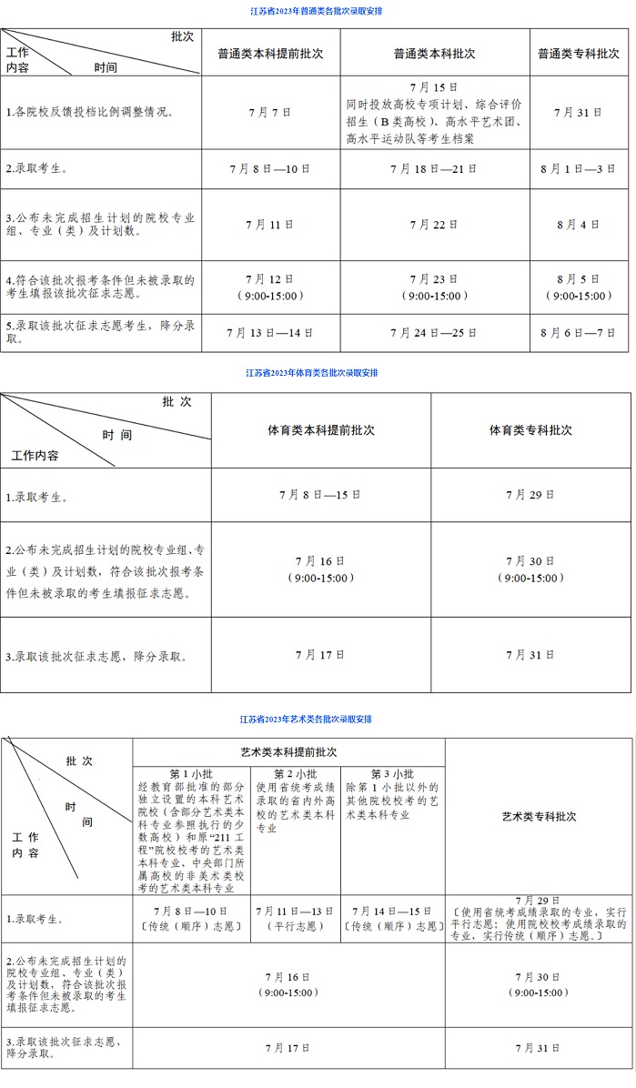 2023年江苏省普通高校招生录取批次和时间安排如下。
