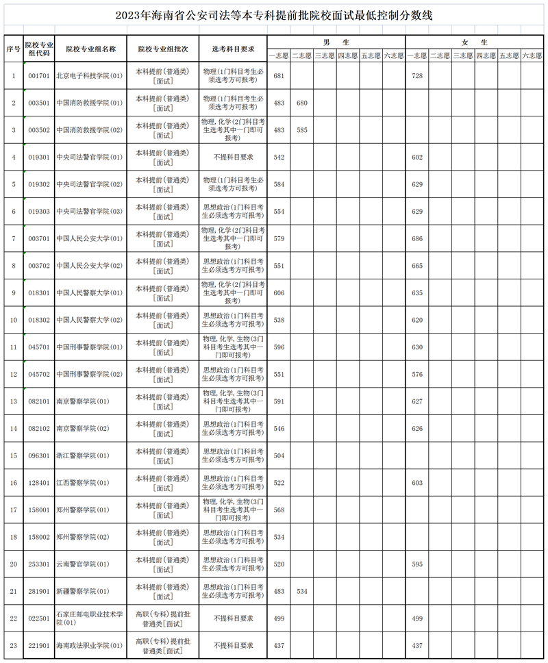 2023海南公安司法消防等本专科提前批院校面试最低控制分数线