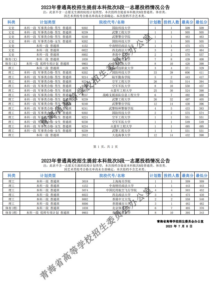 青海2023年普通高校招生提前本科批次B段一志愿投档情况公告