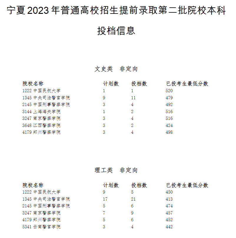 宁夏2023年普通高校招生提前录取第二批院校本科投档信息