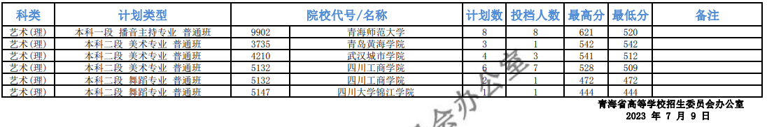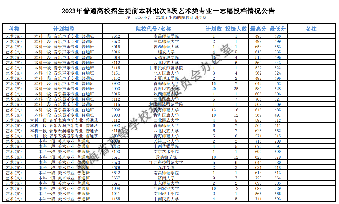 2023年普通高校招生提前本科批次B段艺术类专业一志愿投档情况公告 点击查看