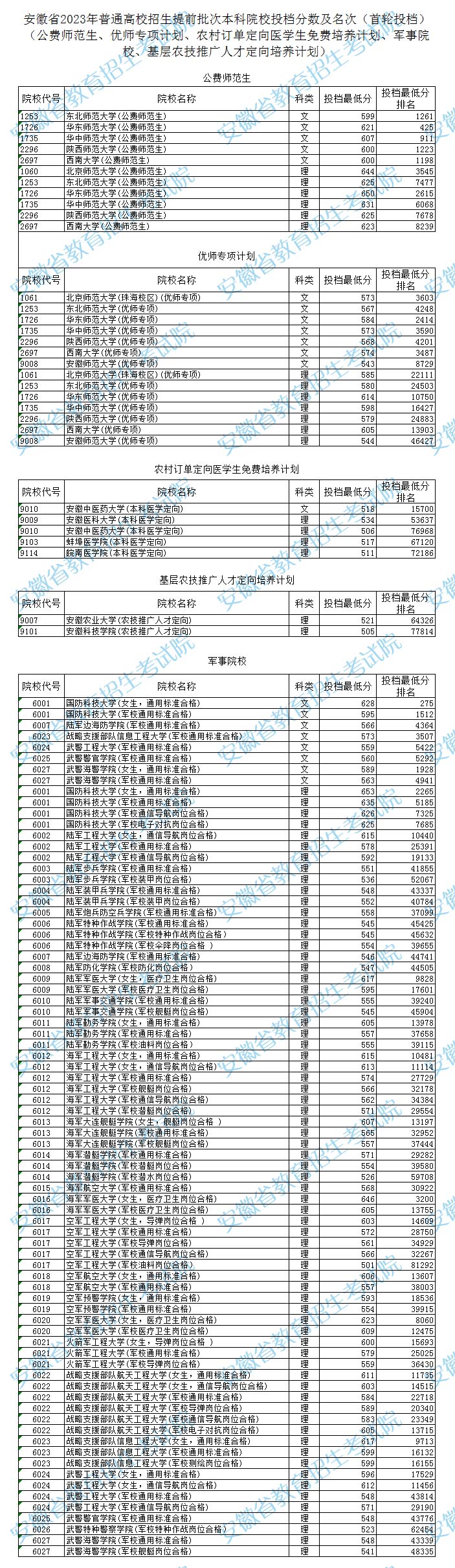 安徽省2023年普通高校招生提前批次本科院校平行志愿投档最低分排名