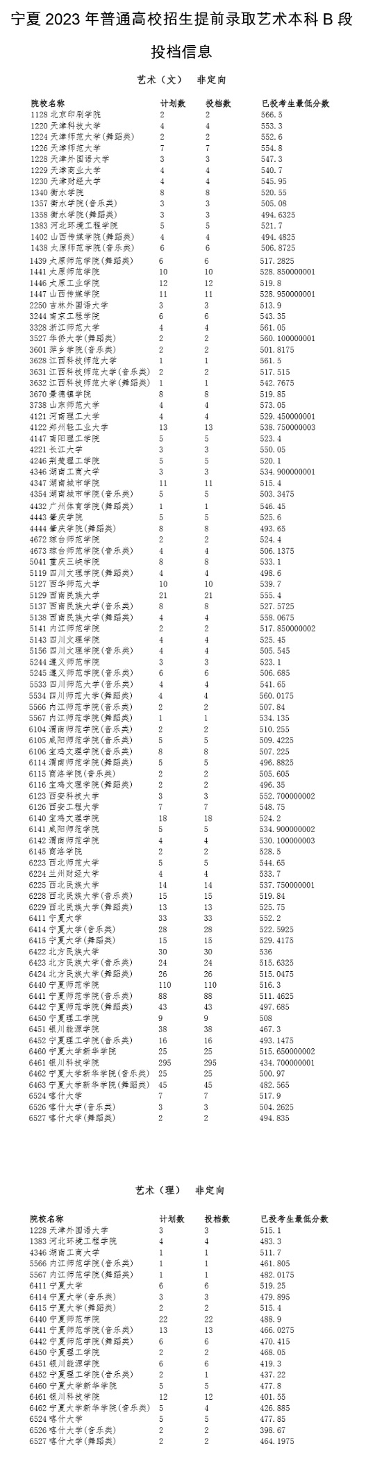 宁夏2023年普通高校招生提前录取艺术本科B段投档信息
