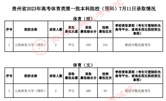 贵州2023高考体育类第一批本科院校(预科)7月11日录取情况